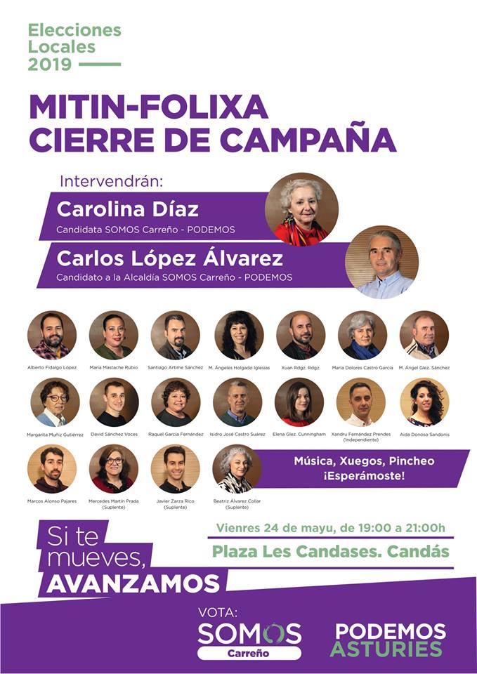 Arrancamos la campaña electoral para las elecciones del 26 de mayo de 2019. Ven a acompañarnos, charlaremos, tomaremos un culete y os presentaremos a las compañeras y compañeros de la candidatura municipal de SOMOS Carreño-PODEMOS. Estaremos frente al Centro Polivalente La Baragaña, en Candás. Te esperamos.