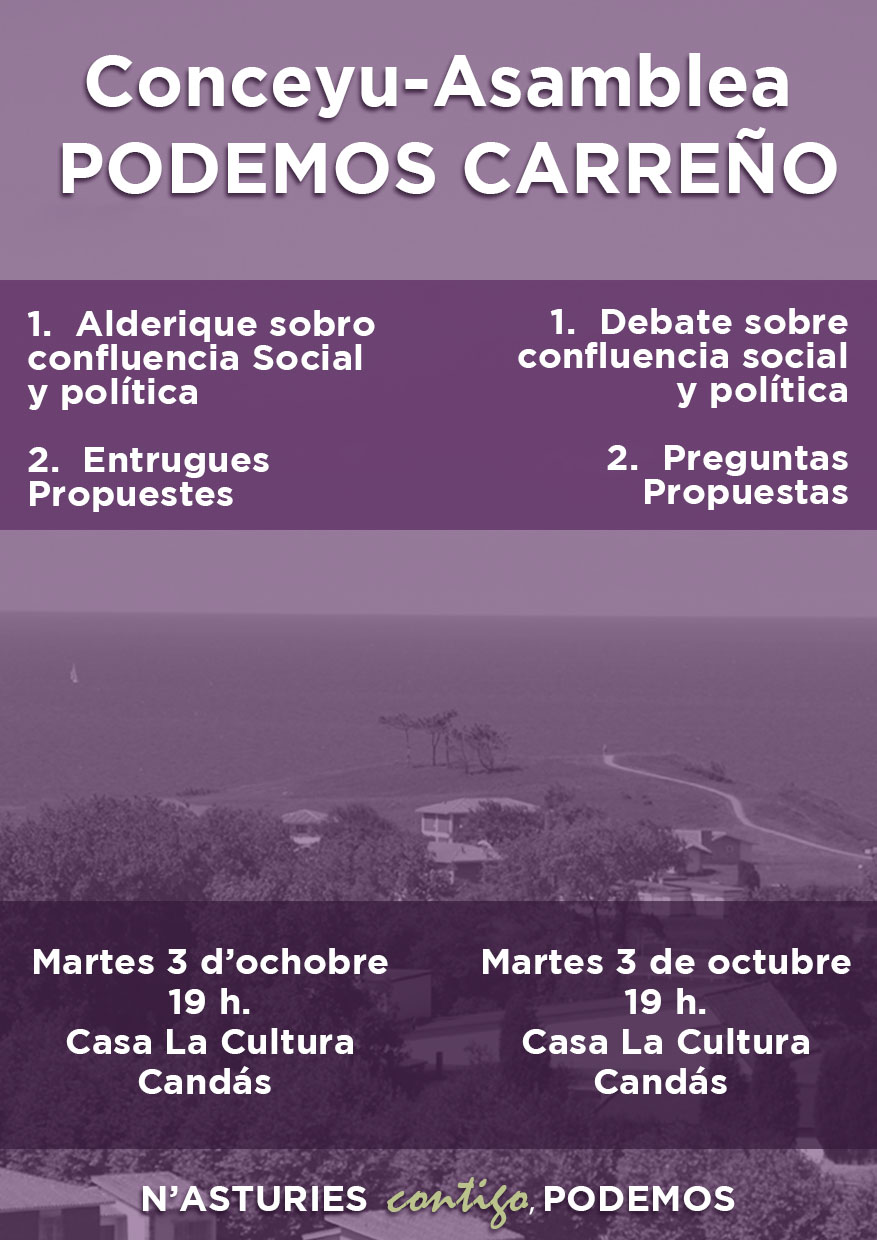 El próximo martes 3 de octubre, se celebrará asamblea de PODEMOS Carreño en la Casa la Cultura de Candás. En esta ocasión nos veremos a partir de las siete de la tarde para debatir sobre la posibilidad de apertura de contactos con movimientos sociales, tejido asociativo y fuerzas políticas, para explorar posibles confluencias en un futuro.